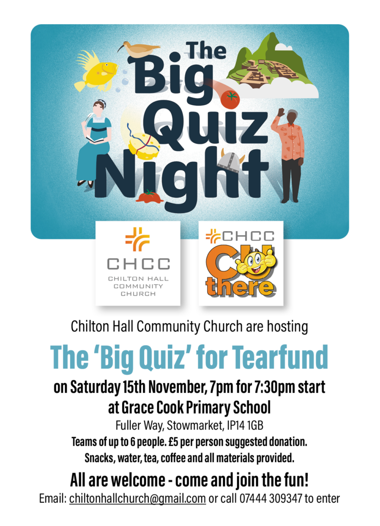 - Saturday 16th Nov – The Big Quiz for Tearfund at Grace Cook School, 7 for 7:30pm (see poster below)