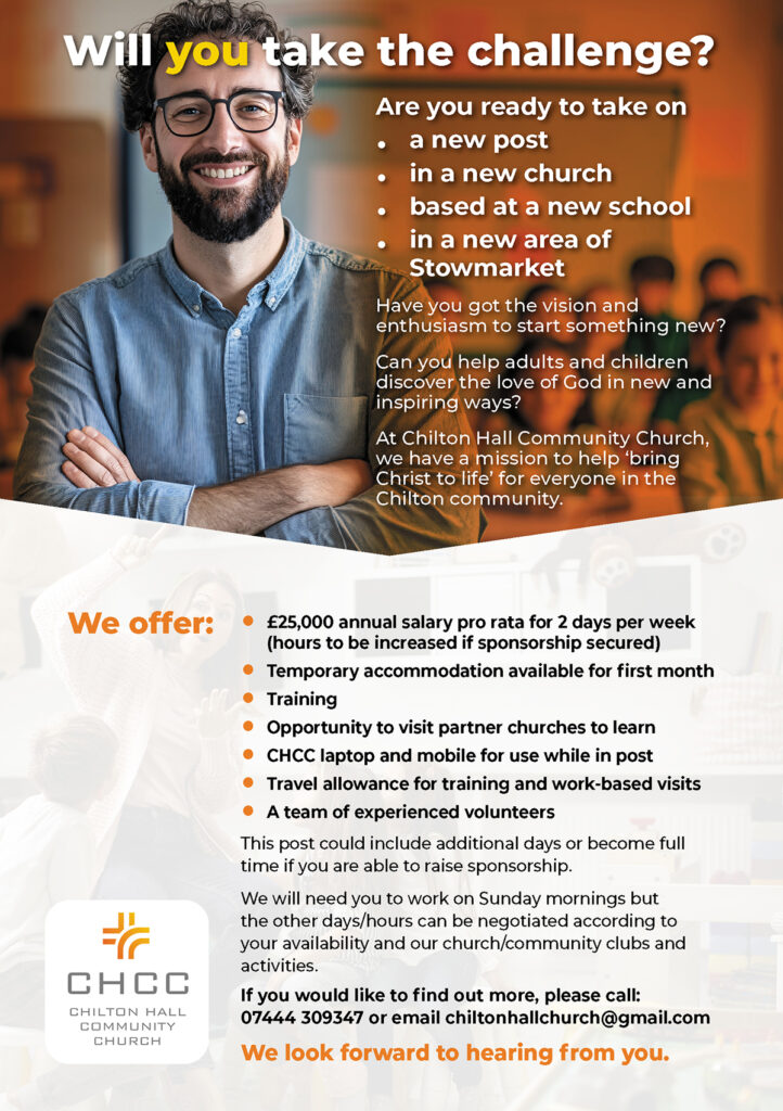 We are looking to appoint a part-time assistant pastor with an interest in children’s work to help us build our relationships with local primary schools and develop our own children’s work at CHCC. If you are interested please give us a call on 07444 309347 or email chiltonhallchurch@gmail.com.