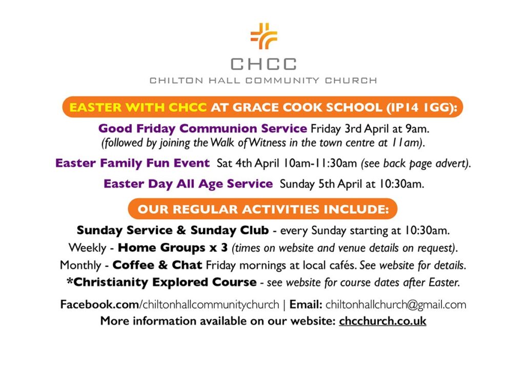 - Sun 5th Apr, 10.30am – Easter Sunday all-age service. Speaker Jon Steed